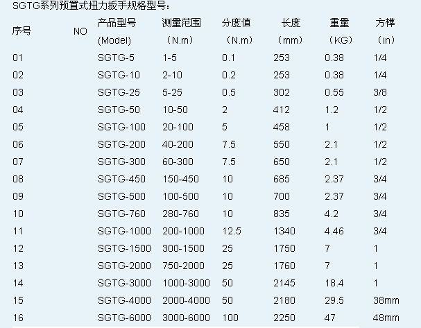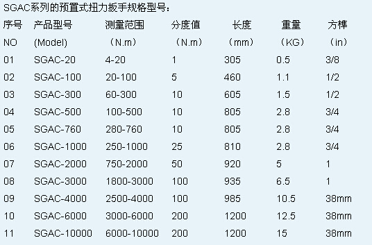 鑄衡預(yù)置式扭力扳手型號有SGTG系列和SGAC系列的。SGTG系列預(yù)置式扭力扳手量程范圍在1-6000n.m,而SGAC系列的預(yù)置式扭力扳手量程范圍在4-10000n.m。